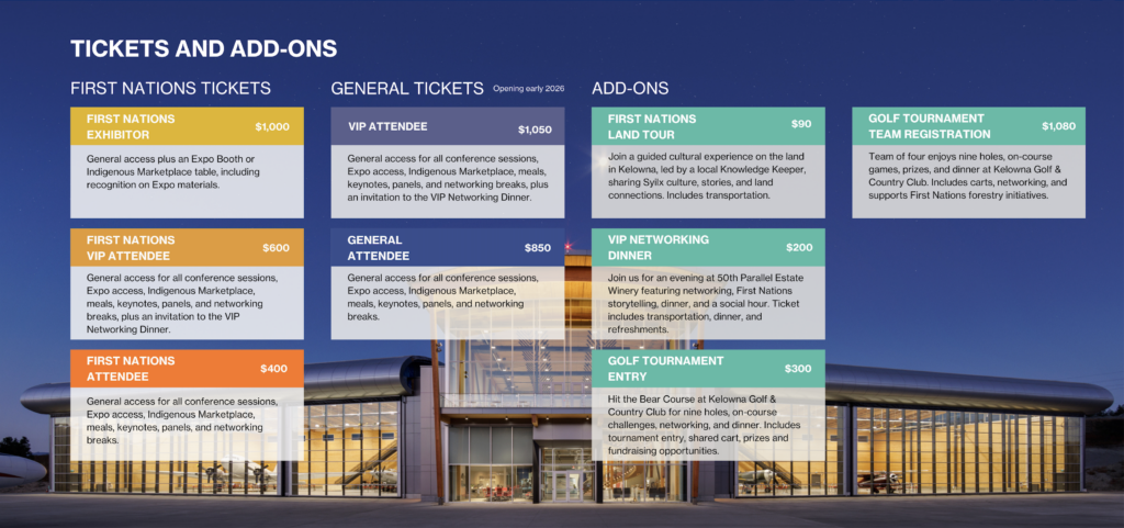 Join leaders, innovators, and partners at this province-wide event to advance First Nations-led forestry. Your investment connects decision-makers, emerging leaders, and industry partners to drive sustainable forest practices, economic opportunity, and long-term community impact. Join us. Strengthen relationships. Amplify impact. Lead with purpose.